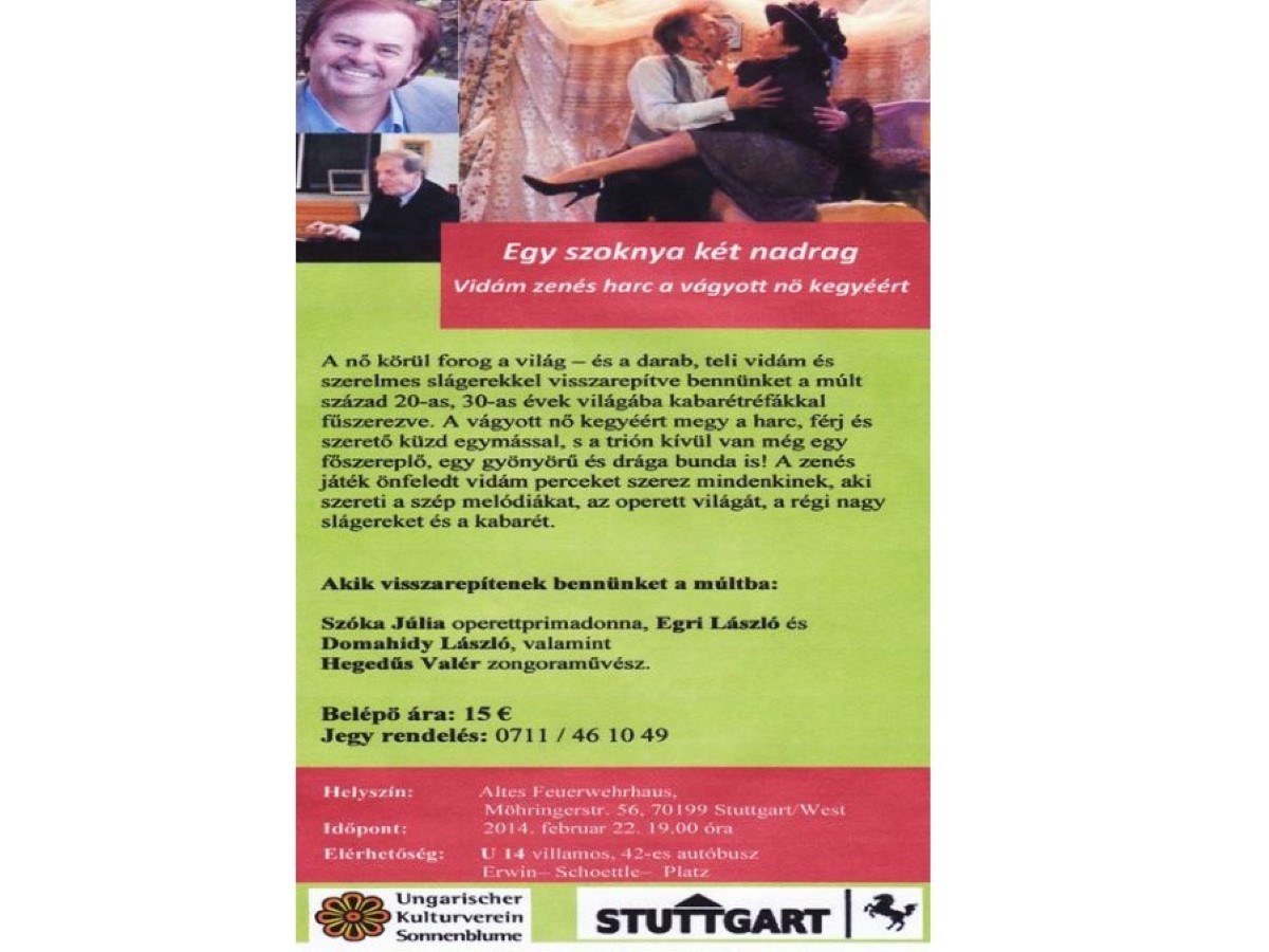 Beküldő: Ildiko Riester, 23 január, 2014 Város Stuttgart Kép Programtípus Koncert A hozzászóláshoz regisztráció és bejelentkezés szükséges