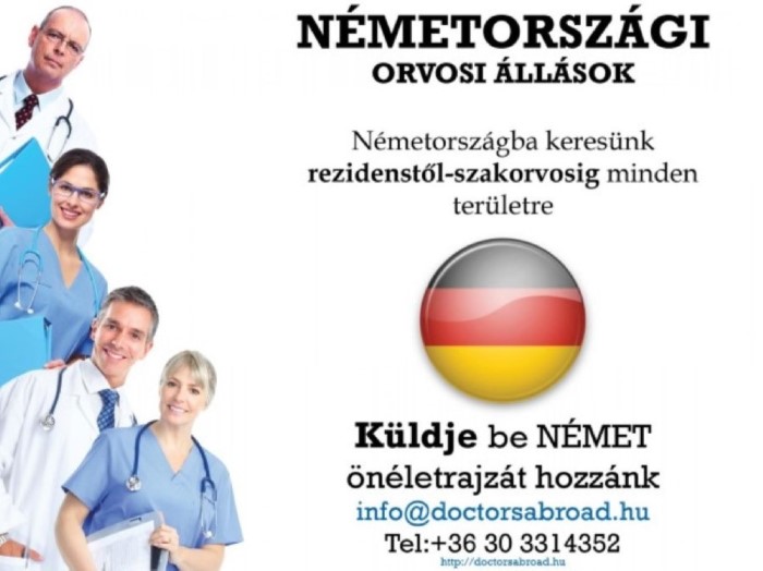 Német kórházak számára keresünk végzés elõtt álló orvostanhallgatókat (hatodéves), frissen végzõs orvosokat, rezidenseket, szakorvosjelölteket és szakorvosokat a medicina összes szakterületén hosszú távú állások betöltésére. Anyagi és szakmai megbecsültség, kiszámítható, tervezhetõ jövõkép, kiváló karrierlehetõség és nyugat-európai életkörülmények. Jelentkezzen most! Jelentkezési kritériumok - Európai Uniós (EU) vagy European Community/European Economic Area (EC/EEA) - Orvosi diploma - Minimum középfokú német (B2) nyelvvizsga vagy Göethe nyelvvizsga www.goethe.de, www.testdaf.de vagy www.osd.at - Rugalmasság, megbízhatóság, szakmai igényesség - Szakmai elkötelezettség - Hajlandóság a továbbképzéshez (mind szakmai mind nyelvi) - flexibilitás, hajlandóság Németország legalább 10 szövetségi államban dolgoznia felajánlott állások közül - 12 hónapnál nem hosszabb inaktív gyógyító tevékenység Állás ajánlatunk - Kiemelkedõ németországi fizetés Euróban/Német bértábla szerint, vagy privát helyen ennél magasabb/ - Német egészségbiztosítás - Nyugat-európai kórházi munkakörülmények - Szakmai továbbképzési lehetõség - Stabil és kiszámítható munkakörnyezet és karrier út - Teljes németországi ügynökségi háttértámogatás - Szakmai és társadalmi megbecsültség - Fejlett tudományos és kutatási lehetõségek, mind az alapkutatások, mind pedig a klinikum területén Bővebben is: http://doctorsabroad.hu/germany.html http://doctorsabroad.hu/germany.html