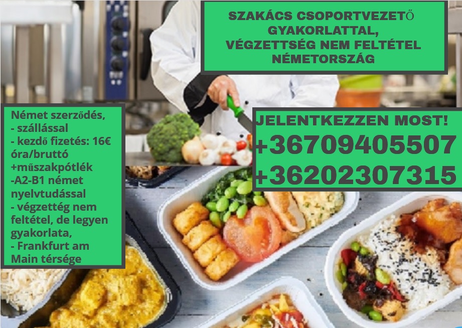 Azonnali kezdéssel keresünk 2 fő szakácsot,akik a mellett, hogy részt vesznek a termelésben, irányítják, illetve csoportvezetői feladatokat is ellátnak a többi 10 szakács dolgozó mellett. Szakács végzettség nem feltétel, de gyakorlattal rendelkezni kell, valamint stabil A2 vagy B1 német nyelvtudással.