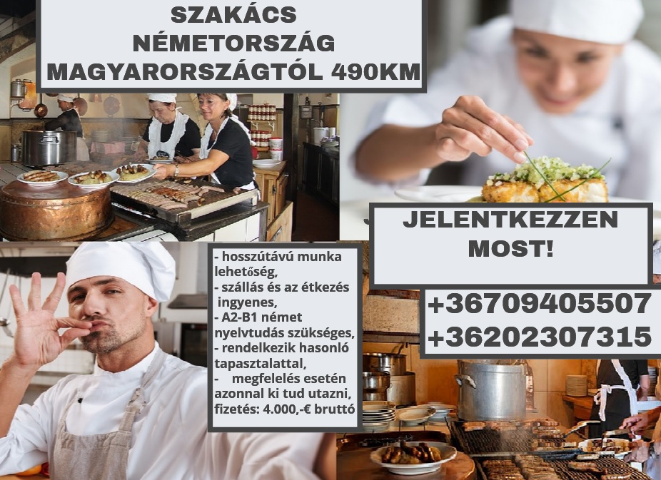 Azonnali kezdéssel keresünk 1 fő gyakorlattal rendelkező szakácsot, Németországba, Magyarországtól 490 m-re. Jelentkezni lehet: fényképes, német nyelven írt önéletrajzzal, megjelölve mikor tud kiutazni. A kiutazás, önállóan önköltségen történik a kapott címre.