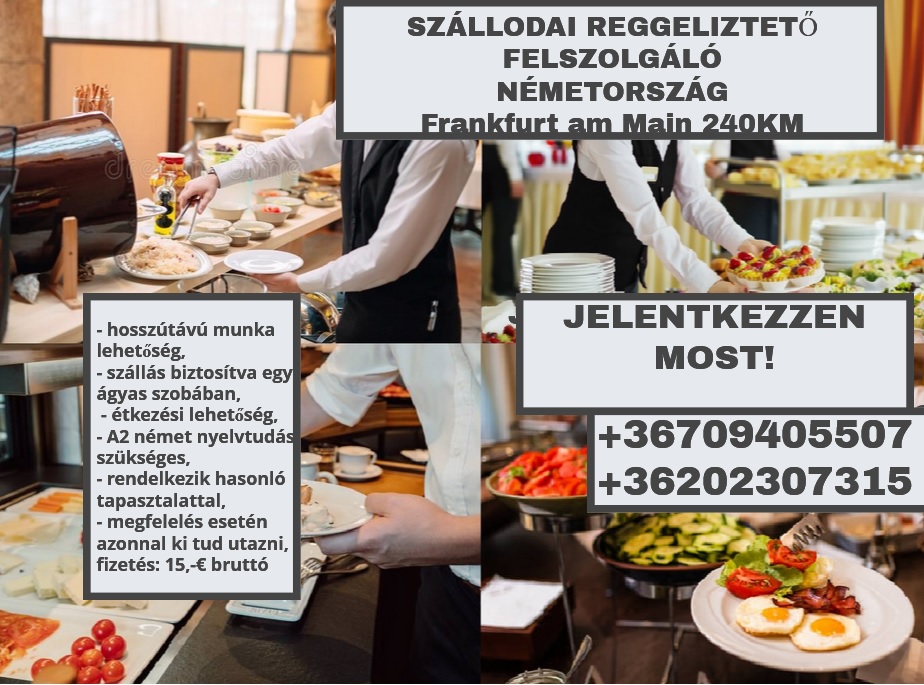 Azonnali kezdéssel keresünk 1 fő gyakorlattal rendelkező szállodai reggeliztető felszolgálót, Németországba. Jelentkezni lehet: fényképes, német nyelven írt önéletrajzzal, megjelölve mikor tud kiutazni. A kiutazás, önállóan önköltségen történik a kapott címre.