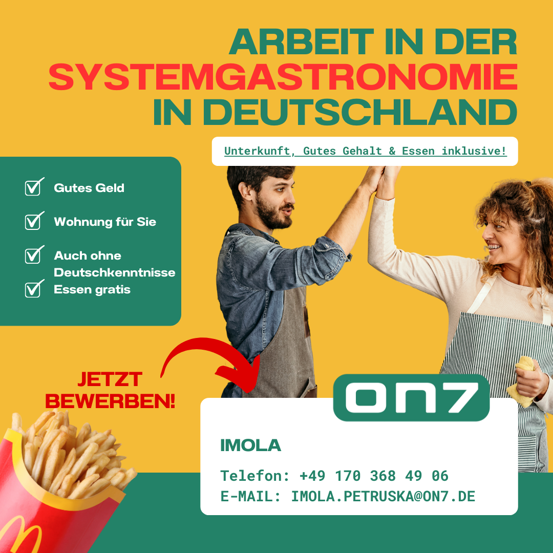 Ha szeretnél jelentkezni, várjuk önéletrajzod az imola.petruska@on7.de címre vagy telefonon a +49 170 368 49 06 (tel, Whatsapp) számon.