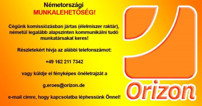 Az Orizon GmbH - KOMISSIÓS - munkatársakat keres.
