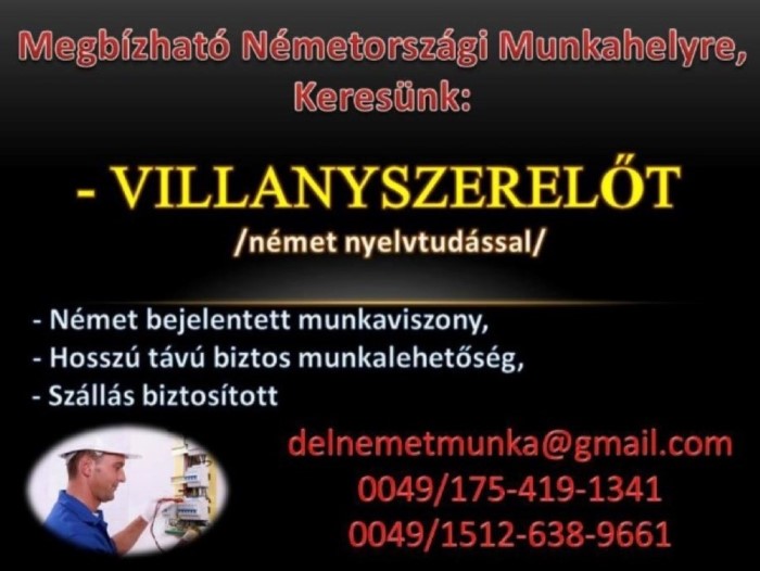 Keresünk: Villanyszerelőt, német nyelvtudással.